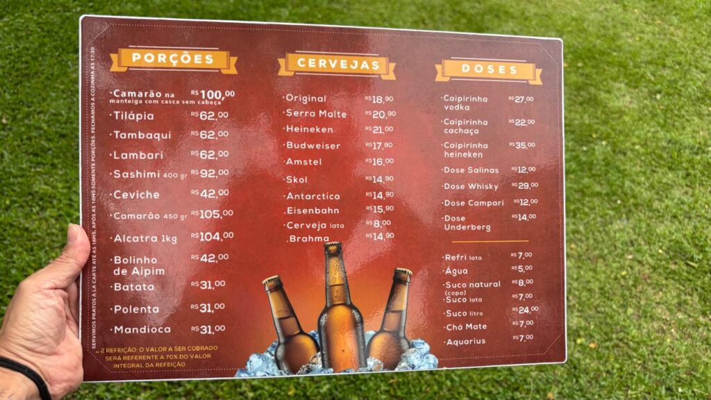 Para o almoço tem porções, sashimi, peixe e até churrasco com acompanhamentos! Confira o cardápio nas imagens abaixo!